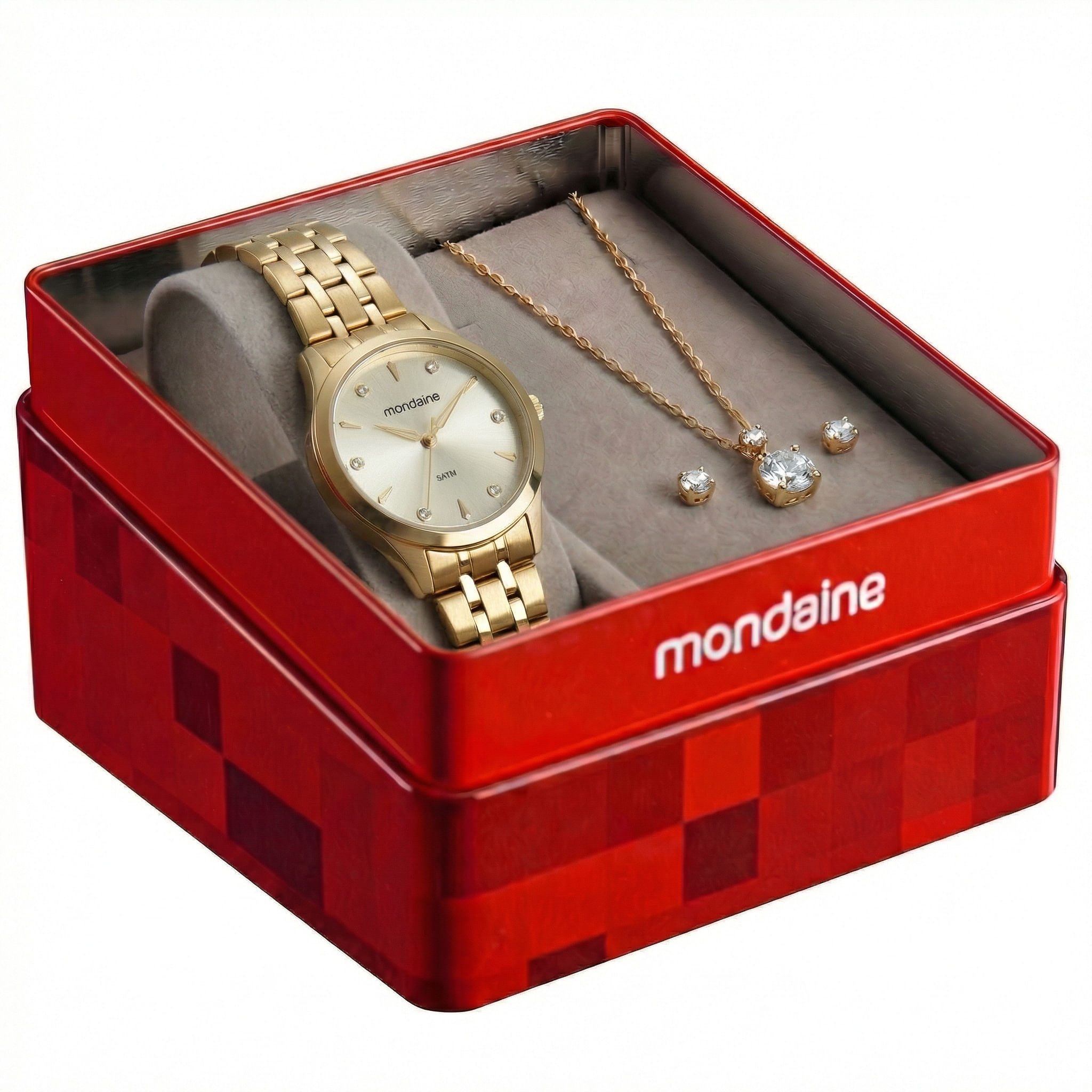 A pulseira em aço dourado oferece durabilidade e conforto, adaptando-se com segurança ao pulso da usuária. Acompanham o relógio um colar e um par de brincos ponto de luz, criando uma composição harmoniosa de acessórios metálicos. A construção integral em tons dourados reforça o perfil sofisticado e clássico desta peça.