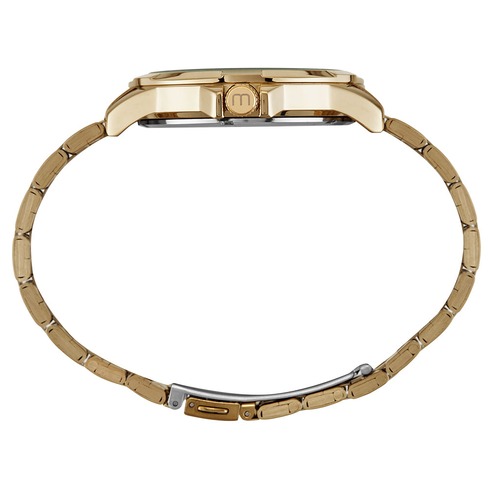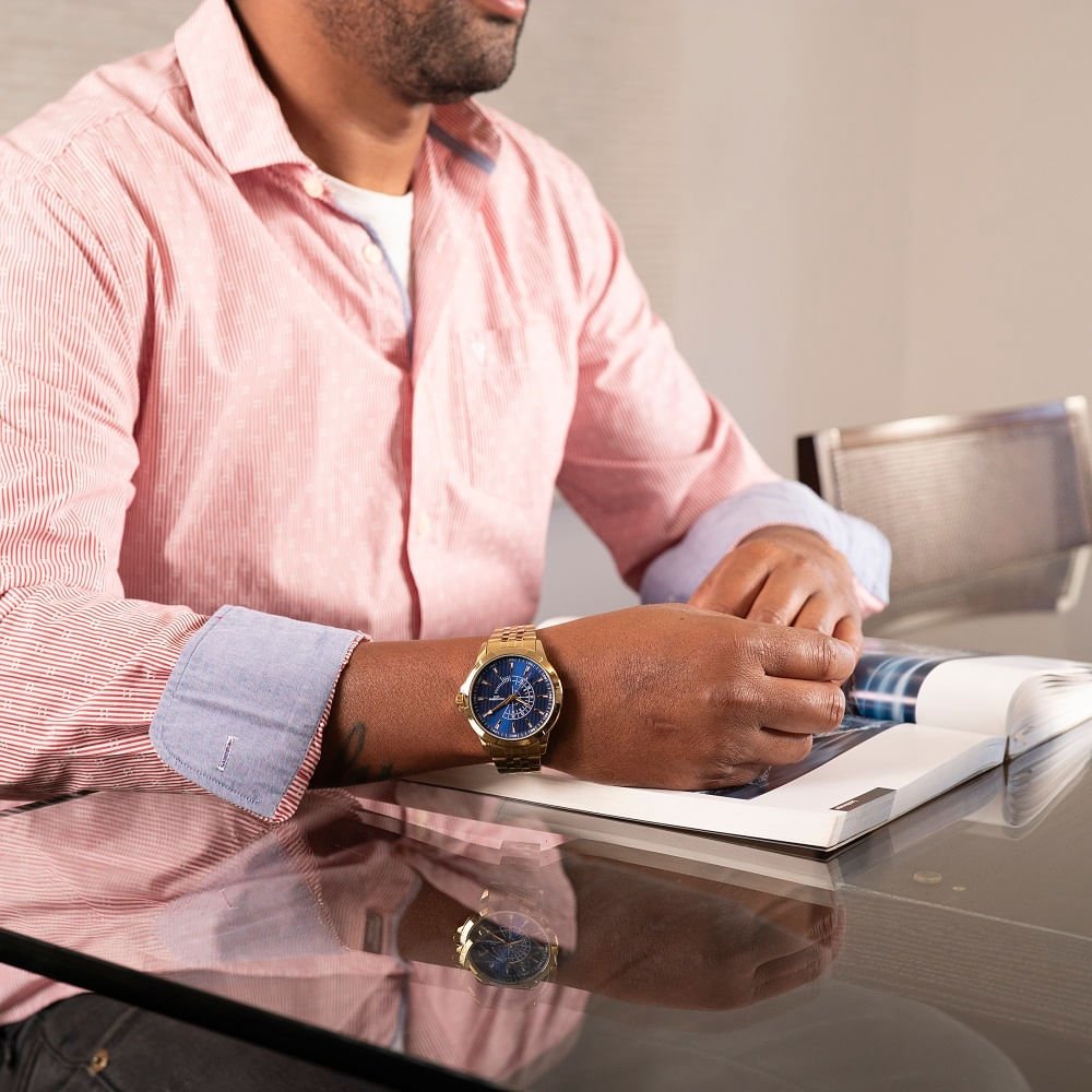 Para enriquecer qualquer visual, o moddelo traz a combinação elegante do dourado com azul. Este relógio analógico tem caixa em metal, visor texturizado e marcadores geométricos. Sua pulseira é de aço escovado com frisos entremeio polido, com fecho de acionamento lateral. Ideal para pulsos pequenos e médios.