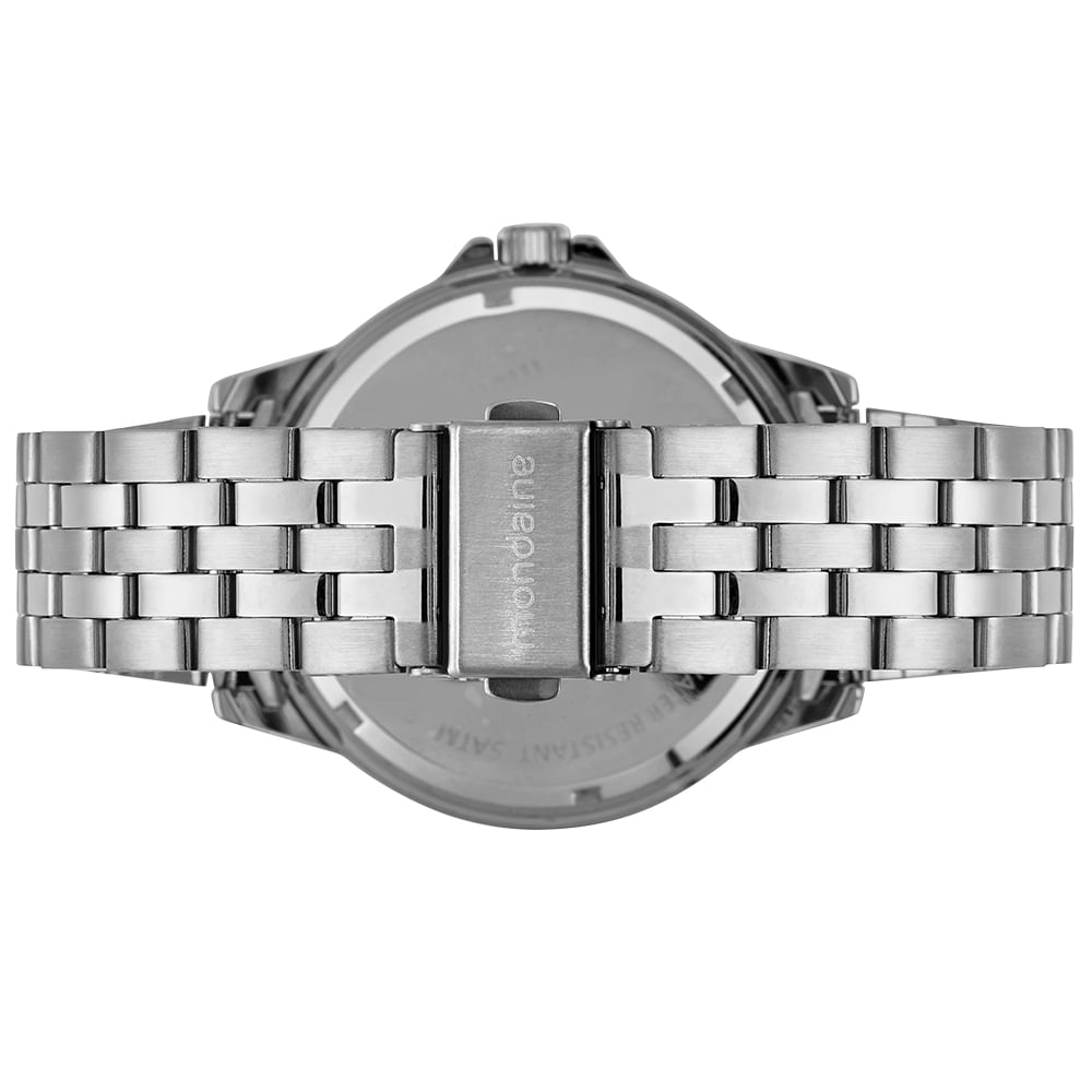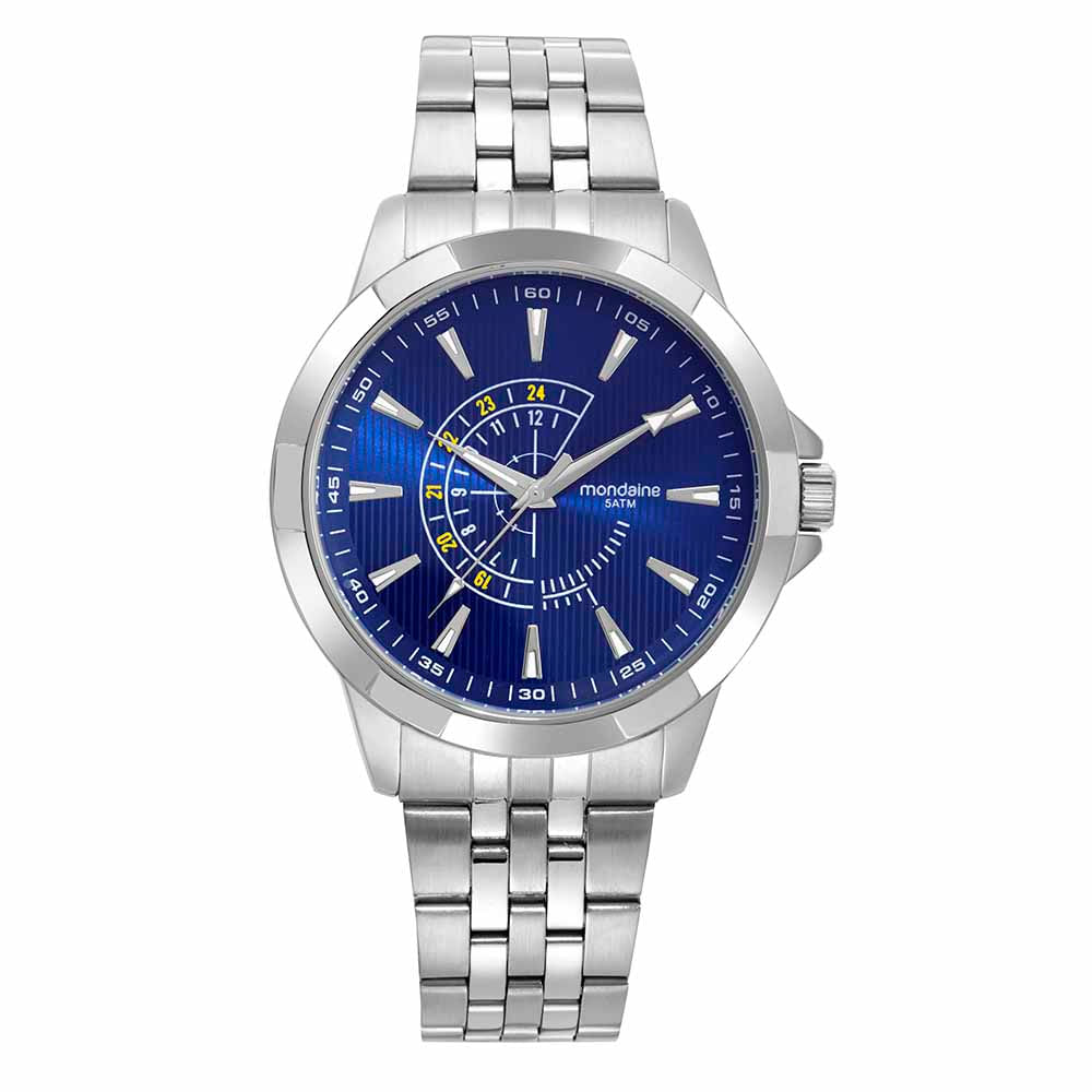 O relógio traz a combinação sofisticada do prata e azul, conferindo um visual moderno ao look. Tem caixa em metal cromada e marcadores geométricos com detalhes amarelos. Sua pulseira é de aço escovado com frisos entremeio polido, com fecho de acionamento lateral. Ideal para pulsos pequenos e médios.