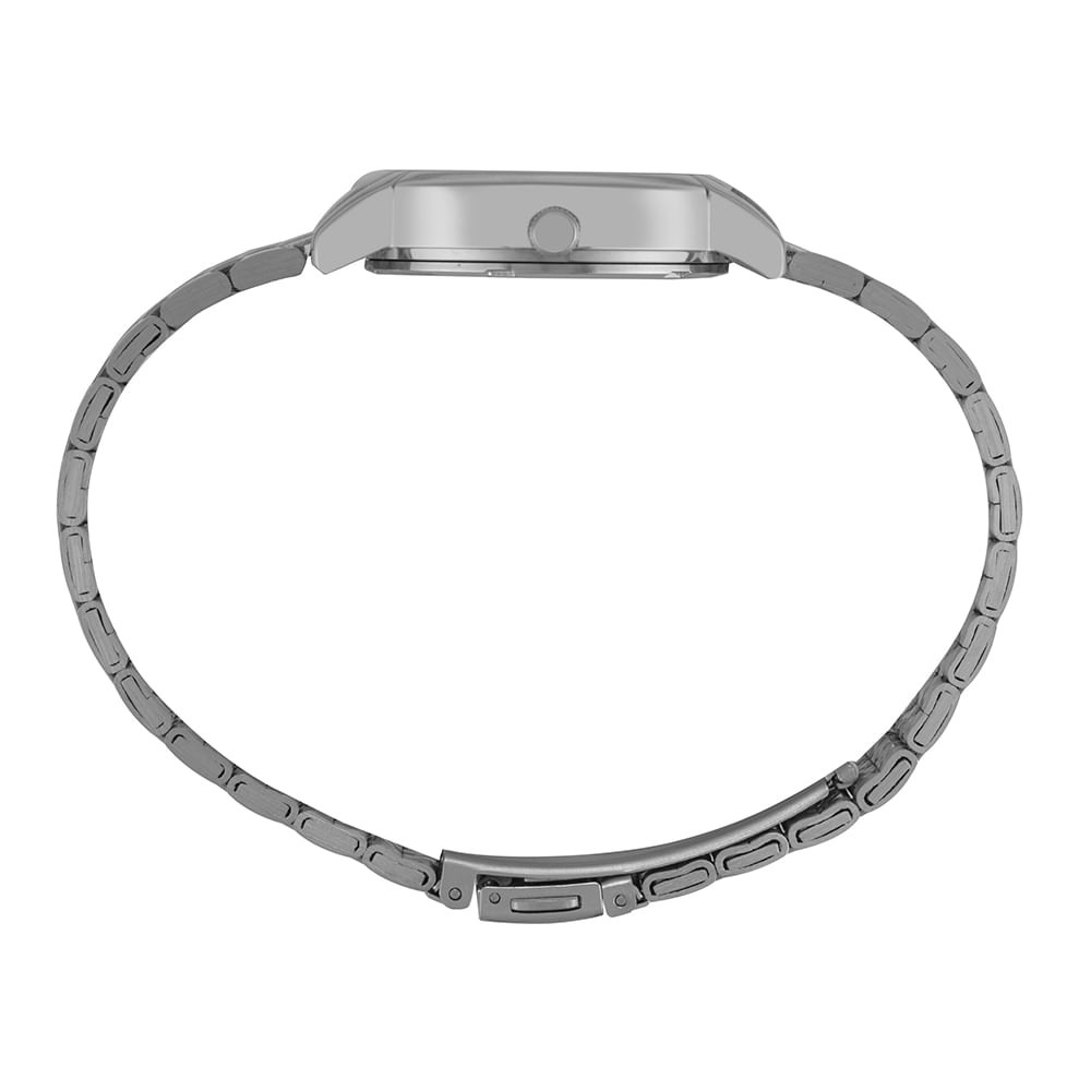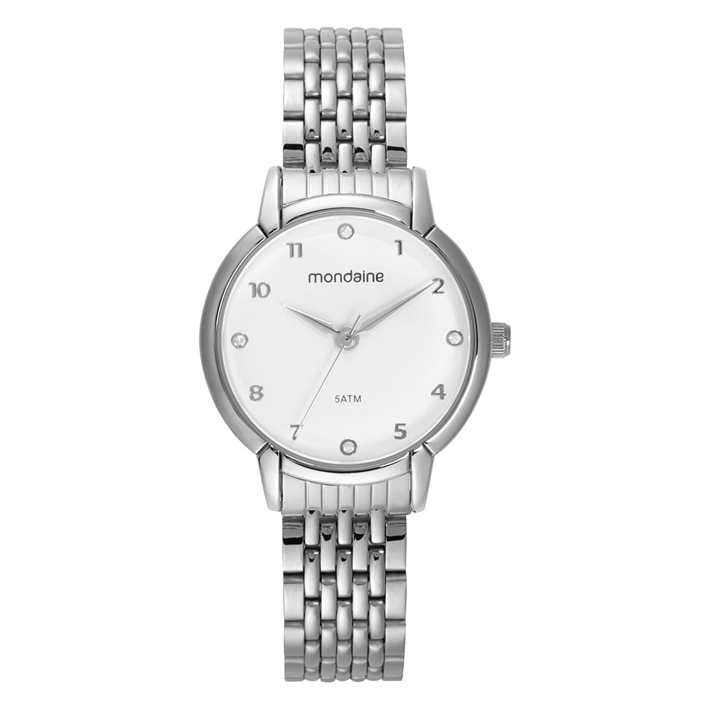 Conheça o estilo e a elegância com nosso relógio analógico. Com uma caixa texturizada de 3,2 cm de diâmetro, este relógio acomoda-se perfeitamente em qualquer tamanho de pulso. O mostrador é adornado com pedras brilhantes, acrescentando um toque sofisticado. Sua pulseira de aço é super resistente, garantindo durabilidade e conforto. Escolha um relógio com folheação prata que combina com qualquer ocasião.
