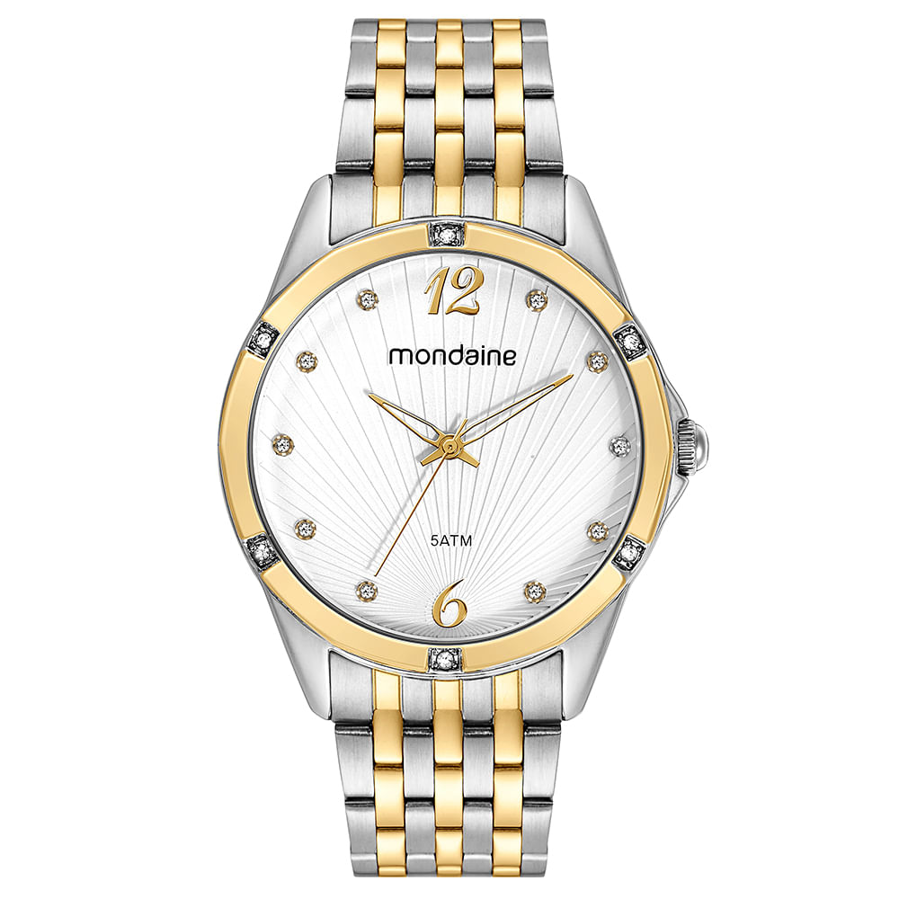 Relógio com pedras na caixa, mostrador texturizado e marcação com números e cristais. Possui função analógica, folheação bicolor e pulseira em aço com fecho por acionamento lateral. É um relógio elegante, ideal para usar no dia a dia. Esse relógio possui a caixa em 4 cm de tamanho.