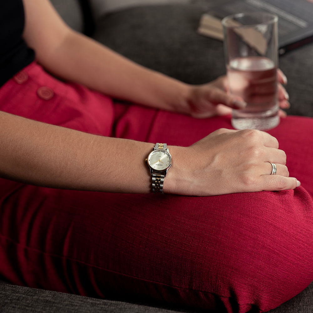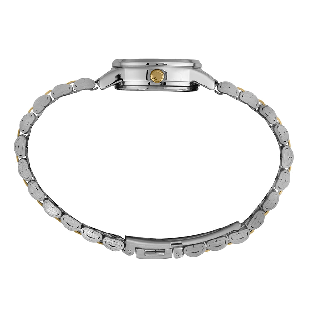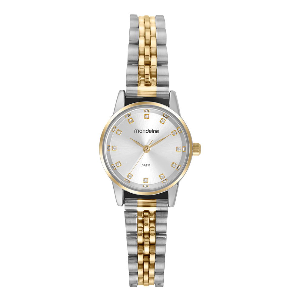 Conheça a elegância refinada com nosso relógio analógico clássico. Apresentando um visor metalizado e marcadores em cristais, este modelo combina folheação em prata e dourado em uma caixa de metal de 2,5 cm de diâmetro que se ajusta confortavelmente a todos os tamanhos de pulso. A pulseira de aço complementa o design, garantindo durabilidade e estilo. Escolha um relógio que une sofisticação e versatilidade para qualquer ocasião.