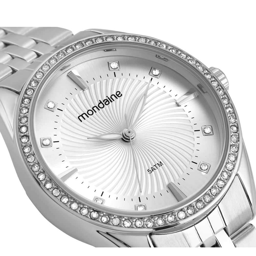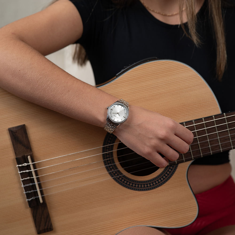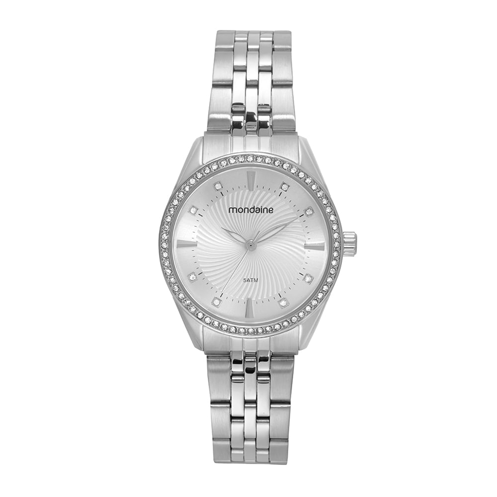 O relógio analógico possui um visor texturizado com cristais nos marcadores e na caixa, conferindo-lhe um toque elegante e sofisticado. Com uma caixa de 3,2 cm de diâmetro, este relógio é ideal para todos os tamanhos de pulso. Sua pulseira de aço escovado e polido complementa o design, proporcionando conforto e durabilidade excepcionais. Este relógio é perfeito para compor o look adicionando um toque de brilho.