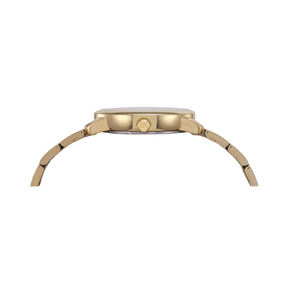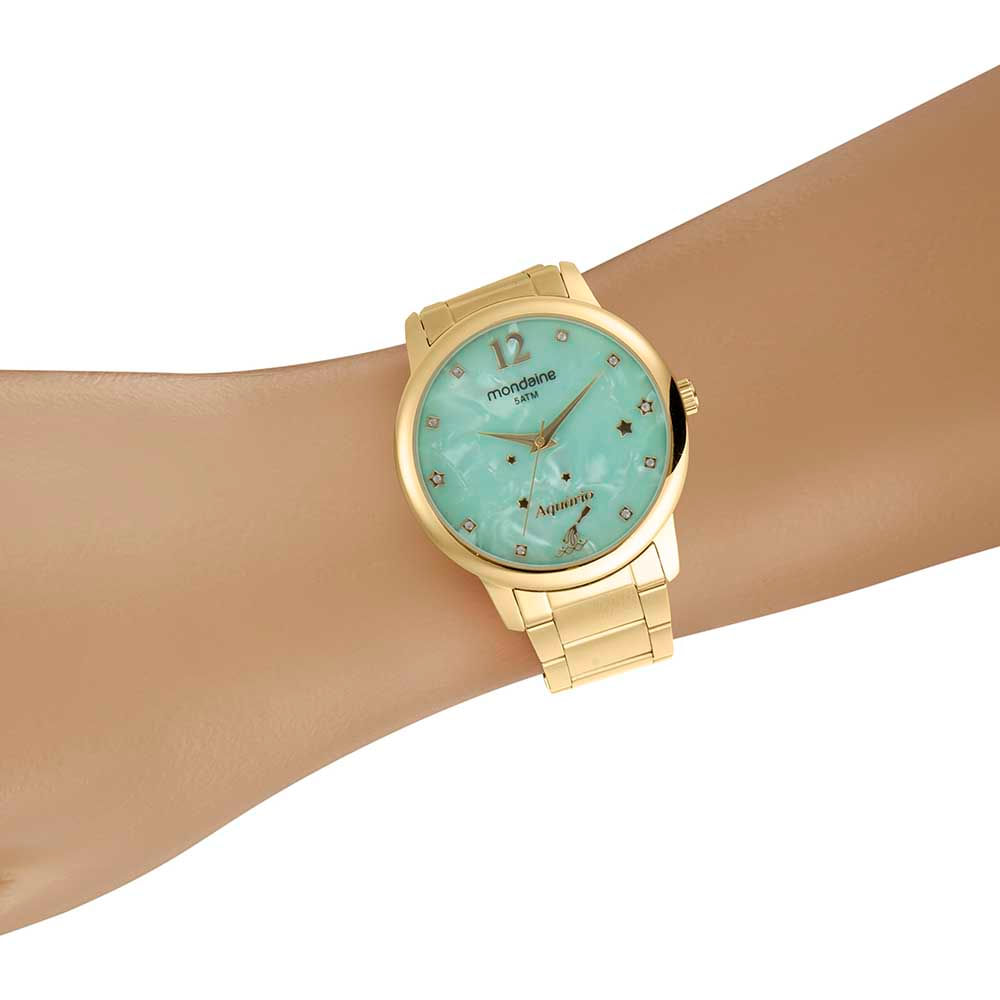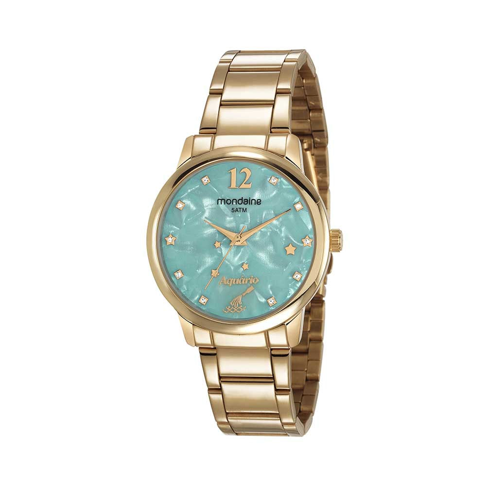 Relógio analógico com elegante folheação dourada, destacando-se pelo símbolo de Aquário no mostrador com um efeito madrepérola. O relógio apresenta cristais e estrelas no visor, adicionando um toque personalizado e significativo. Ideal não apenas como acessório, mas também como um presente único e memorável para os entusiastas de astrologia.