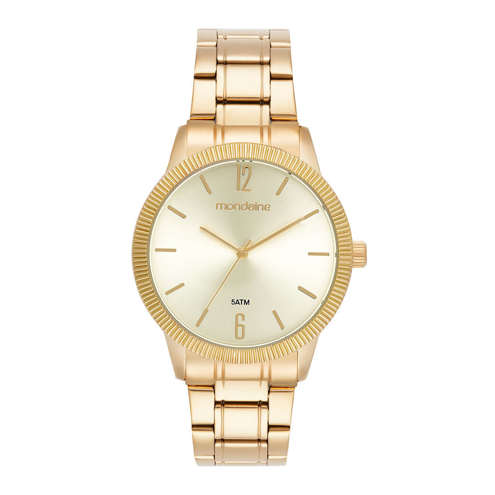 O Relógio Feminino Mondaine Analógico Dourado destaca-se por sua sofisticada caixa redonda de 40mm em metal com banho dourado. Seu mostrador em tom champagne cria uma harmonia visual requintada, enquanto os números e indexes completos garantem uma leitura de horas clara e precisa. Uma peça que irradia luxo e bom gosto.