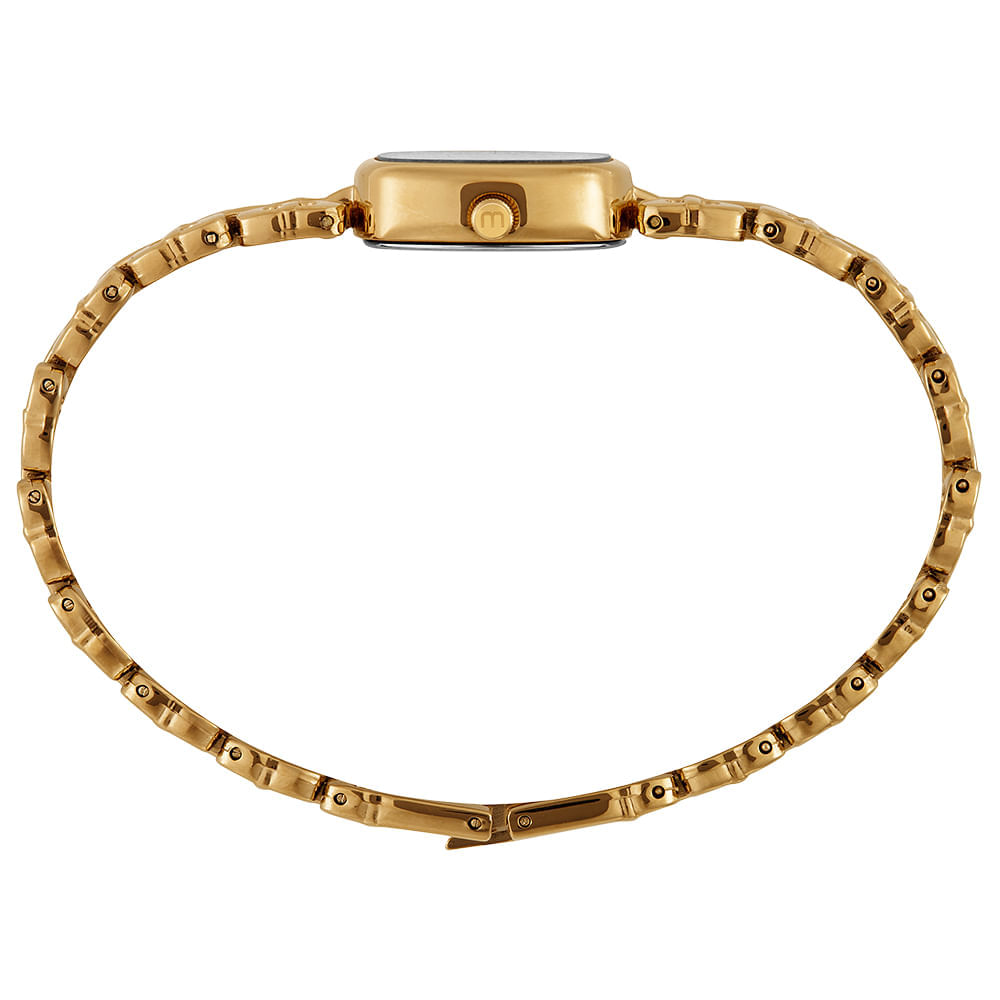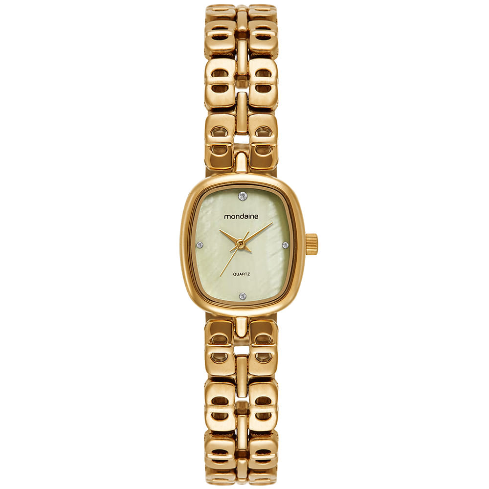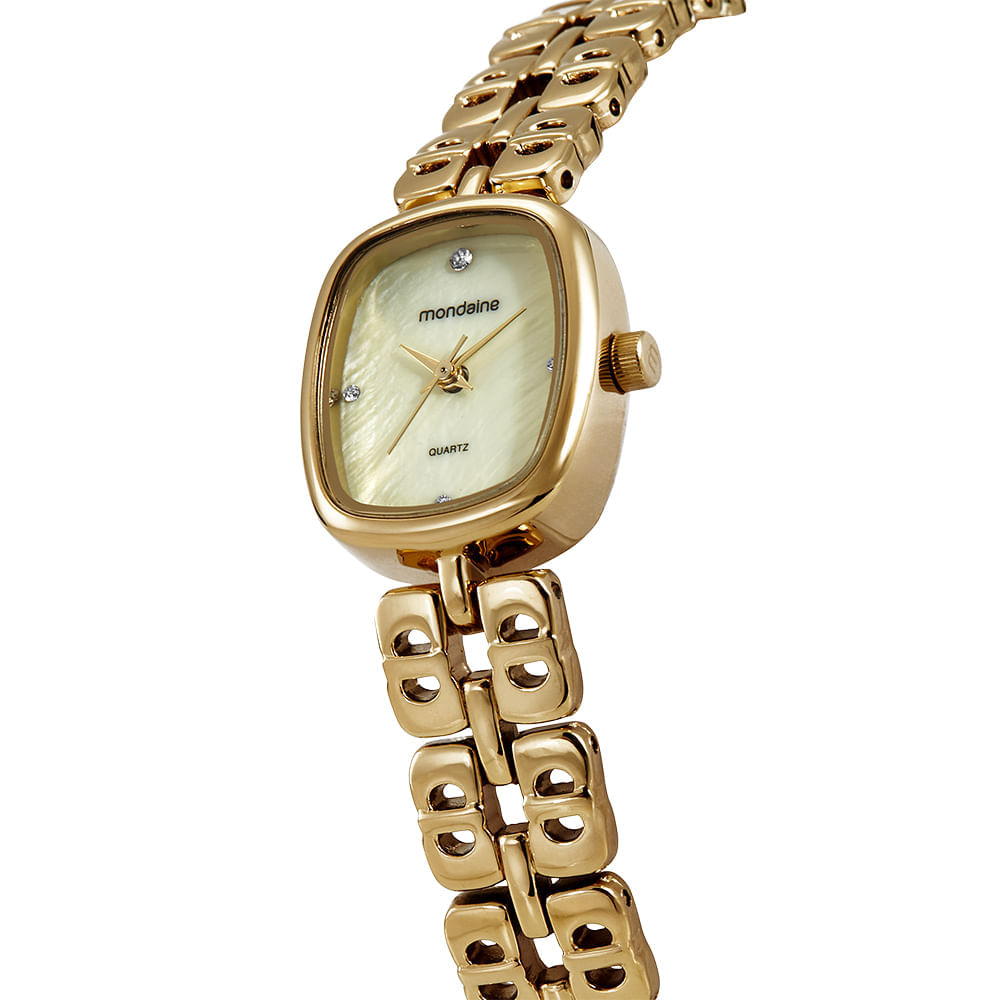 Este modelo feminino distingue-se pelo seu formato oval e pela pulseira sólida com elos diferenciados. O mostrador em madrepérola traz um brilho natural único, complementado pela marcação de horas com cristais. A caixa de metal dourado envolve a peça com delicadeza e elegância.
