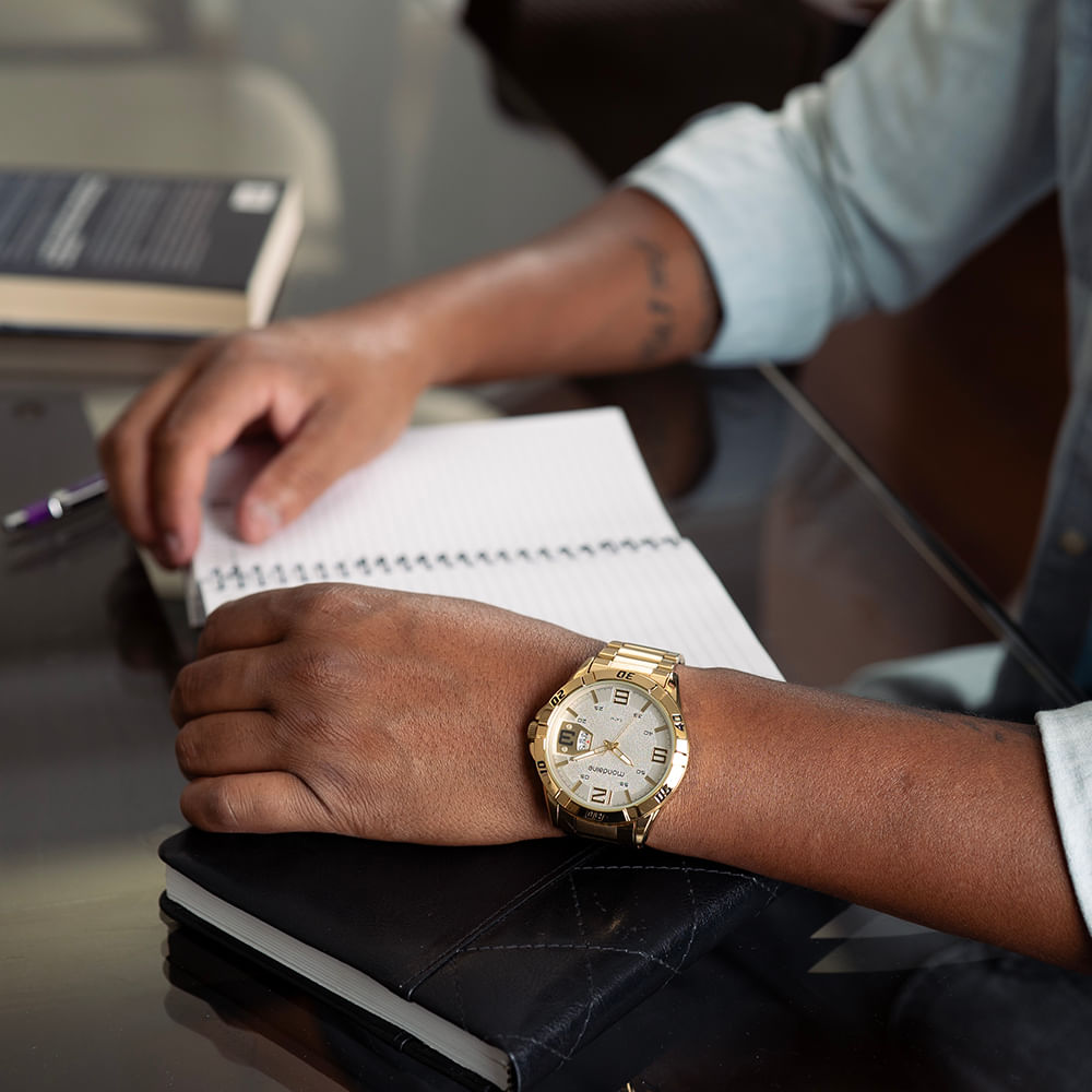 O relógio analógico masculino com calendário apresenta uma folheação dourada e um mostrador branco texturizado, proporcionando um visual sofisticado. Com uma caixa de 4,8 cm de tamanho, este relógio ajusta-se perfeitamente a todos os tamanhos de pulso. Destacam-se os marcadores geométricos e os marcadores numéricos, além das marcações na catraca, que adicionam funcionalidade e estilo. Sua pulseira de aço escovado e polido não apenas complementa o design, mas também oferece durabilidade e conforto superiores. Este relógio é ideal para qualquer ocasião, combinando elegância e praticidade.
