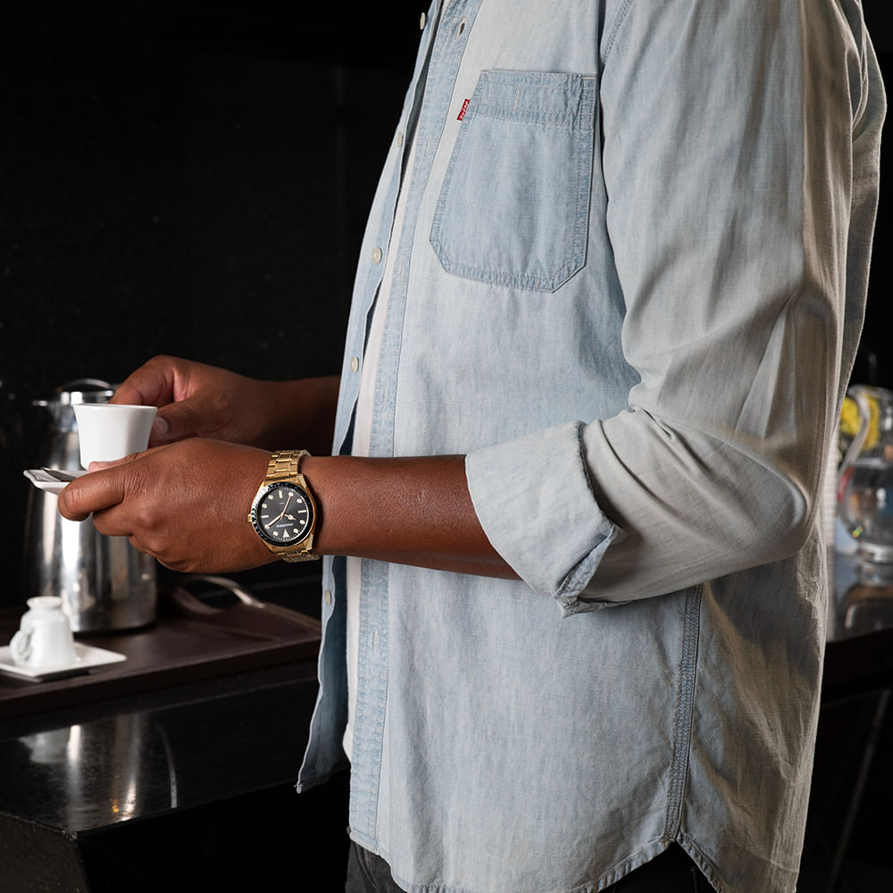 Este relógio analógico é uma peça de estilo refinado. Com uma caixa de 4,2 cm de diâmetro e um visor preto, enriquecido por uma folheação dourada, este relógio é todo em aço, garantindo durabilidade e elegância. Proporciona um ajuste perfeito para pulsos médios e maiores. Além disso, sua pulseira possui um fecho de acionamento lateral que permite um ajuste fácil e preciso. Seja para o dia a dia ou ocasiões especiais, este relógio é o complemento perfeito para o seu estilo.