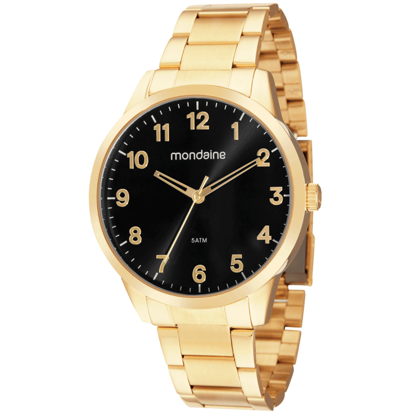 Este relógio contém numeração completa, visor preto e caixa de metal dourado com função analógica. A pulseira trabalhada em aço dourado, possui fecho por trava de segurança. Esse relógio possui a caixa em 4,8 cm de tamanho.