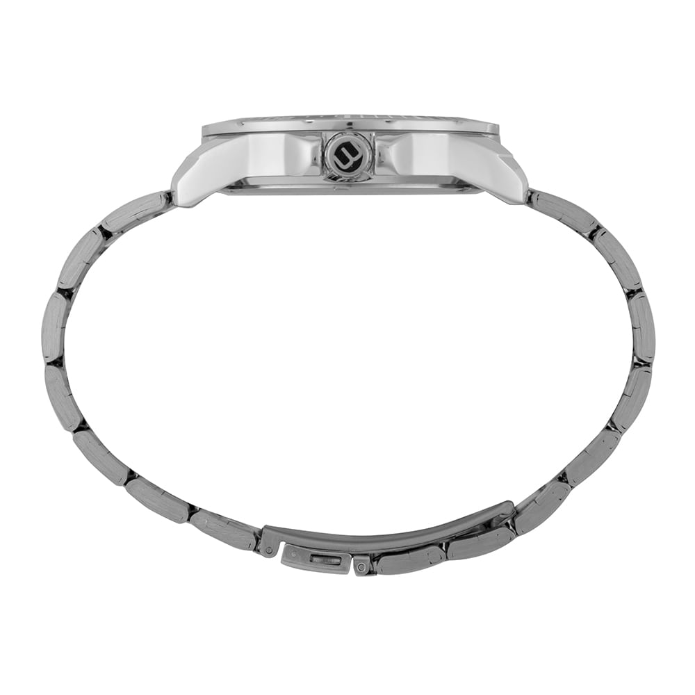 Este relógio analógico prata combina funcionalidade e estilo moderno, com mostrador preto e efeito metálico, marcadores geométricos e detalhes em vermelho na catraca. Sua caixa em metal, com 4,4 cm de diâmetro, proporciona um ajuste confortável no pulso. A pulseira de aço, com detalhes foscos e polidos, possui fecho de acionamento lateral para fácil ajuste. Um acessório ideal para o dia a dia, que une praticidade e design arrojado.