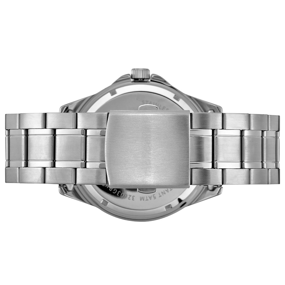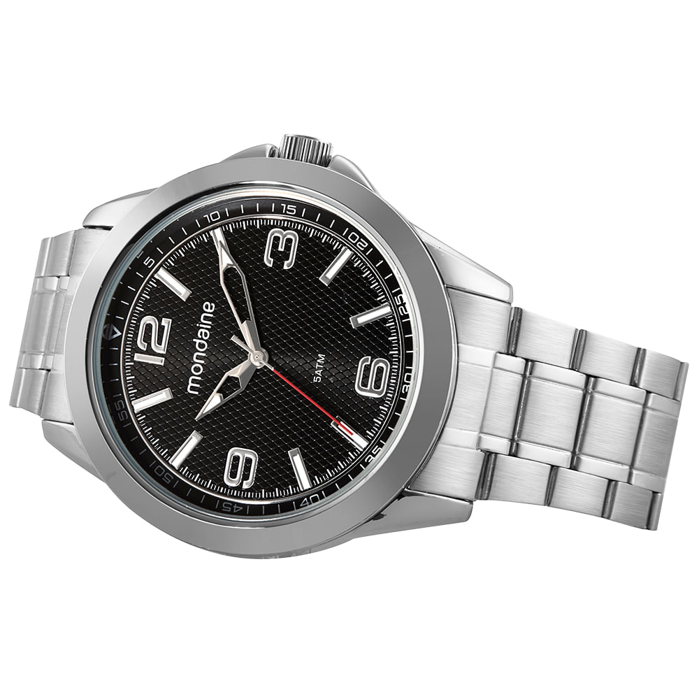 Ideal para os amantes de acessórios robustos e imponentes! Este relógio destaca-se pela folheação prata, um mostrador preto texturizado com marcadores numéricos e geométricos, além de ponteiros vazados. Sua pulseira é habilmente trabalhada em aço escovado e polido, com frisos entremeio, apresentando um fecho de acionamento lateral que proporciona um ajuste excepcional para pulsos médios e maiores. Com uma caixa de 4,8 cm, este relógio é uma escolha marcante que combina estilo audacioso com funcionalidade, perfeito para quem busca acessórios de presença.