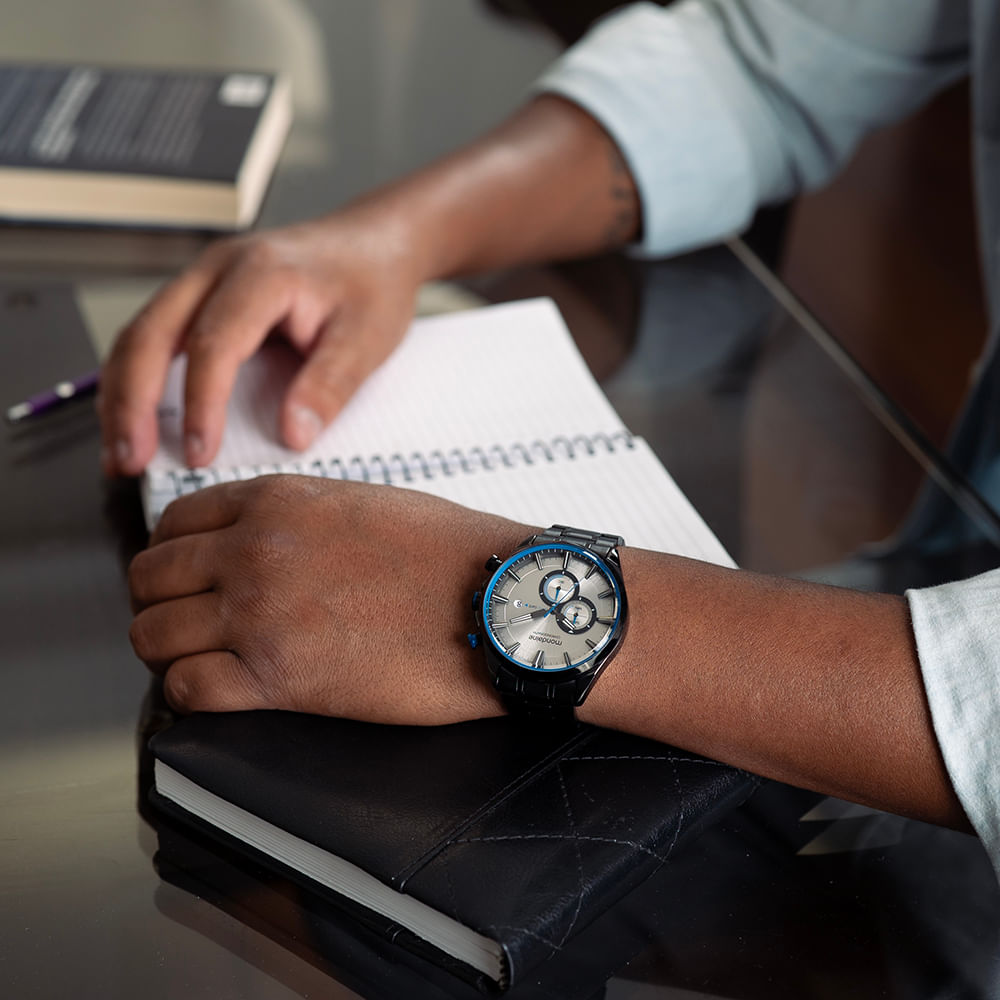 Este relógio cronógrafo imponente é definido por sua folheação preta, que adiciona um toque de elegância e sofisticação. Com uma caixa robusta em metal de 4,7 cm de diâmetro, apresenta marcadores geométricos e detalhes em azul, que destacam seu design moderno. A pulseira de aço escovado e polido não apenas complementa o visual, mas também oferece resistência e conforto excepcionais. Este relógio é ideal para todos os tamanhos de pulso, combinando estilo e funcionalidade de maneira harmoniosa. Adicione este acessório impressionante à sua coleção e eleve seu estilo com confiança.