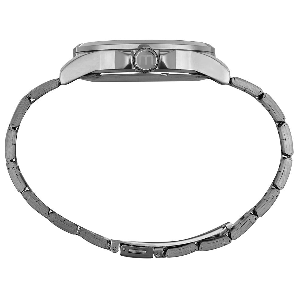 A pulseira em aço prata completa o visual sofisticado e versátil.
